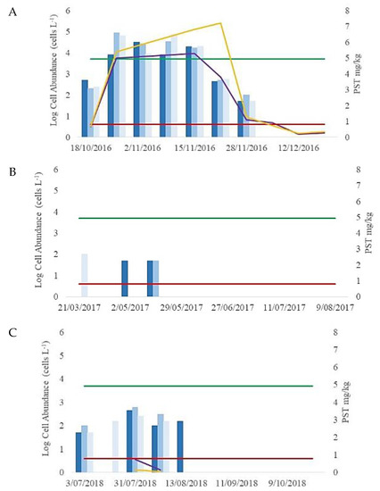 Alexandrium pacificum cell abundance at three sites (Site 1 dark blue; site 3 blue and site 4 light blue) across (A) 2016; (B) 2017; and (C) 2018 bloom events. Dark purple line is paralytic shellfish toxin (PST) concentration in mussels (mg/kg) collected from Area A; yellow line is PST concentration in mussels (mg/kg) from Area B; green line is DPI Phytoplankton Alert Level (5000 cells L−1) and red line is DPI Regulatory Limit for PST in shellfish (mg/kg) in shellfish.