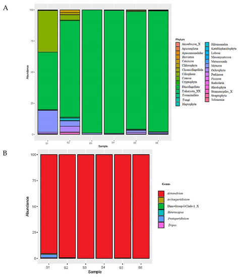 Eukaryotic community composition in samples. (A) Abundances of the dominant group in the phylum level. (B) Abundances of the dominant genus of the most dominant phylum, dinoflagellata S1 and S2 stand for sample from the sampling site 1 (Figure 1), S3 and S4 stand for sample from the sampling site 3 (Figure 1), S5 and S6 stand for sample from the sampling site 4 (Figure 1).