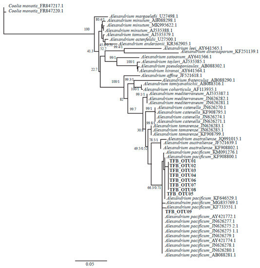 Finally, the phylogenetic analysis of the Alexandrium obtained revealed that the sequences were placed in a strongly supported clade with sequences from multiple Alexandrium pacificum strains from the NCBI database (Figure 4, 66.3/0.71 ML BS/Bayesian PP).