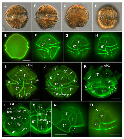 Light micrographs of Alexandrium pacificum using differential interference contrast (A–D) and epifluorescence microscopy (Solophenyl Flavine staining) of Lugol-fixed cultured cells (E–O). (A) Ventral view with focus in the cell middle, notice the two ends of the sausage-shaped nucleus (n). (B) Dorsal view with focus in the dorsal half of the cell showing the path of the nucleus (n). (C) Antapical view with focus in the cell middle, notice the sausage-shaped nucleus (n) dorsally. (D) Dorsal view with focus on the peripherally located, elongated chloroplasts. (E) General cell shape. (F–H) Ventral view showing the shapes of the first apical (1′) and sixth precingular (6′′) plates. Note the different degree of asymmetry in 1′. (I,J) Ventral views of squeezed thecae showing the thecal plates. (K) Doral view of a squeezed theca showing the thecal plates. (L) Ventral to antapical view showing sulcal plates. (M) Sulcal plates. (N) Ventral epithecal view showing the shapes of characteristic plates 1′, 6′′, and anterior sulcal plate (Sa). (O) The first apical plate (1′) with ventral pore (arrow). Scale bars = 10 µm.