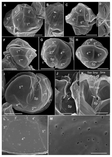 Scanning electron microscopy of Alexandrium pacificum. (A) Ventral of the epitheca. (B) Detail of a first apical plate (1′) with ventral pore (arrow). (C) Right lateral to ventral cell view. (D,E) Apical pore complex. (F) Left lateral view of a hypotheca. (G) Hypotheca in antapical view. (H) Right lateral cell view. (I) Hypotheca in antapical view showing the sulcus. (J) Detail of the posterior sulcal plate (Sp) with posterior connecting pore (arrow). (K) Inside view of the sulcal area of the hypotheca showing sulcal plate details. Note the posterior connecting pore (arrow). (L,M) Thecal pore pattern and sizes. Scale bars = 10 µm, (B,J,K) 5 µm, (D,E,L,M) 2 µm.