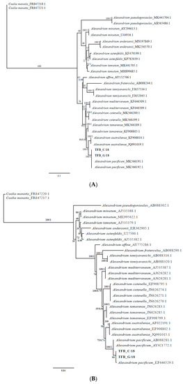 (A,B) Phylogeny of Alexandrium. The trees were constructed with Bayesian Inference (MrBayes). Numbers at nodes represent posterior probabilities from Bayesian Inferences (BI) and bootstrap support values from Maximum Likelihood (ML) based on 1000 replicates. (A) Phylogenetic tree based on large subunit (LSU) rRNA. (B) Phylogenetic tree based on small subunit (SSU) rRNA.