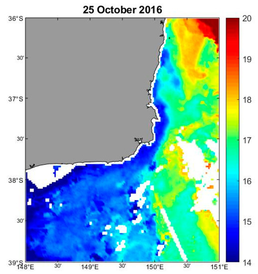 Three-day mean of sea surface temperature (SST) of the south-eastern Australian coastline on 24 October 2016 showing the warm sea-surface temperature extending from the north as red and the cold nutrient rich water extending from Bass Strait in the south as blue (Figure courtesy of Charitha Pattiaratchi, Australian National Facility for Ocean Gliders (ANFOG).
