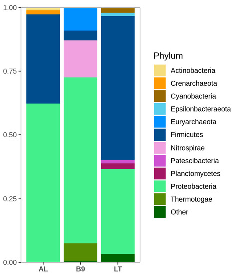 Relative abundance of phyla in the microbial communities of Agua de Limón (AL), Baño 9 (B9) and Los Tachos (LT). Phyla with abundance lower than 1% were grouped as “Other”.