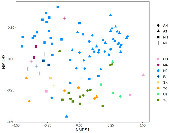 Nonmetrical dimensional scaling plot NMDS of the collection of hot spring microbial communities. Colors correspond to data sources (see Supplementary Table S1), while shapes map for pH and temperature groups. Factor levels for pH were ‘A’ for acidic samples (pH < 5) and ’N’ for circumneutral samples (pH > 5. Temperature categories were ‘T’ for samples with temperature lower than 70 °C and ’H’ for hyperthermophilic samples (temperature > 70 °C).