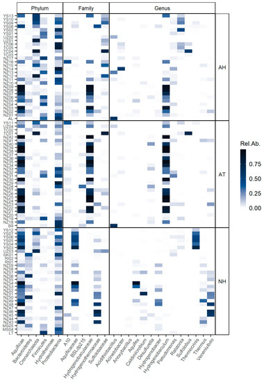 Heatmap of the relative abundance of taxa at different ranks across samples and conditions. Taxa are named and ranked (x-axis) are according to the Silva database. Sample names (y-axis) are fully described in Supplementary Table S1. The first two letters of each sample name correspond to the location of the sample: Malaysia (MS); New Zealand (NZ); Raoul Island, New Zealand (RI); Sikkim, India (SK); Tengchong, China (TC); Uzon Caldera, Russia (UZ); and Yellowstone National Park, USA (YS). LT, B9 and AL are the samples from Caviahue-Copahue and Domuyo described in this study. Sample conditions are described as acidic and hyperthermophilic (AH), acidic and thermophilic (AT) or circumneutral and thermophilic (NH).