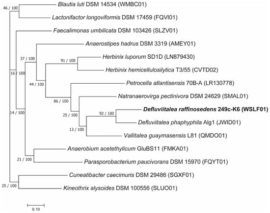 Phylogenetic position of D. raffinosedens isolate 249c-K6 in relation to the most closely related members of the class Clostridia. The tree was constructed applying the UBCG pipeline v. 3 [35] using standard settings based on 92 up-to-date bacterial core genes. In total, 86,940 nucleotide positions were used to build the concatenated alignment. For all branches, the number of examined genes (GSIs, gene support indices) supporting the given topology and bootstrap values are shown as follows: GSI/Bootstrap value. Bar, 0.01 substitutions per position.