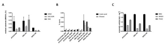 - (B) Metabolite production was compared using three different cultivation media (GS2, GS2.5GR, and GR20) in biological duplicates. Data were normalized to an incubation period of two days at 55 °C. One hundred microliters culture supernatant were measured in a total volume of 500 μL with 50 μL of 0.5% (v/v) 1-propanol as internal standard for quantification.