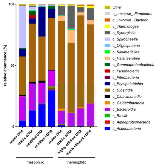 Taxonomic classification at class level of 16S rRNA (cDNA) and 16S rDNA (DNA) amplicon sequences originating from laboratory-scale of biogas reactors under four different process conditions. Values for the relative abundance at class level were averaged over two biological replicates.