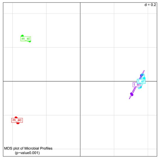 Multi-dimensional scattering (MDS) of the β–diversity of the microbial profiles derived from 16S rDNA and reverse transcribed 16S rRNA amplicon sequences of biogas reactors under four different process conditions with two biological replicates. Samples were grouped for process condition: m_st, mesophilic (38 °C), stable; m_ac, mesophilic, acidified; t_st, thermophilic (50 °C), stable; t_ef, thermophilic, highly efficient.