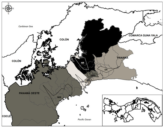 Map of Panama and West Panama. The areas of sampled regions are delimited using polygons. Sampled regions are coded as follows: NR = North region, WR = West region, SMR = San Miguelito region, ER = East region, MR = Metro region and CR = Central region. Regions are colored in a gray scale according to their T. gondii infection percentages and mean ± standard deviation infection percentage ranges as follows: NR (27.94–31.62); WR, SMR (24.26–27.94); ER (20.58–24.26); and CR (16.89–20.57).