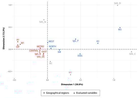 A set of variables, including intrinsic characteristics of dogs and cats (age and behavior) and factors related to their environment, were evaluated through multiple correspondence analysis (MCA). This analysis showed how some regions formed clusters associated with specific variables that could be associated with transmission dynamics in the different regions studied. For example: The West, North and San Miguelito regions were more associated with positive cases in dogs (IgG_P) and with the highest age and weight ranges observed in the sampled population. Conversely, the Central, Metro and East regions showed a higher level of association with the negative cases in juvenile cats and with the lowest weight range found in the population analyzed. Furthermore, cats in the latter regions were also associated with the interaction with other stray dogs and cats (Figure 2).