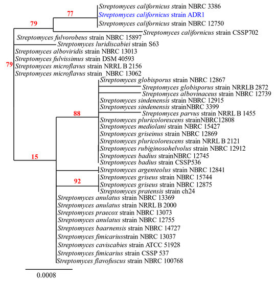 A few strains of S. californicus had been reported earlier from the soil [41,42,43,44]. However, there are no reports of any endophytic strain of S. californicus till date to the best of our knowledge, making the present isolate as a new endophytic actinobacterial strain, designated as S. californicus strain ADR1.