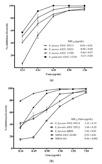 Potency of ADR1 metabolites for Gram-positive pathogens. Minimum inhibitory concentration (MIC90) values of the metabolites against the target pathogens were corelated with its antibacterial potency. Percent inhibition in growth at different concentration of the metabolites was measured against the reference strains as shown in (a) and in (b). The data represented mean ± SEM values of experiments done in triplicate (p value < 0.0001).