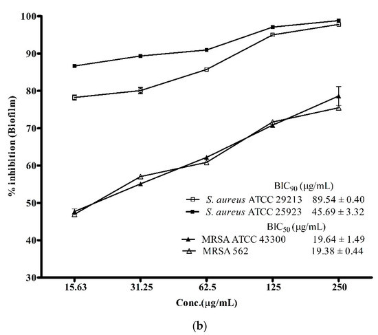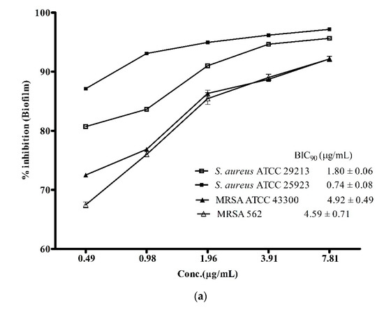 Biofilms of S. aureus ATCC 25923, S. aureus ATCC 29213, MRSA ATCC 43300 and MRSA 562 were produced by using the method published elsewhere [35] in accordance with the CLSI guidelines [33]. Briefly, overnight grown reference cultures were suspended in tryptic soy broth (Himedia, Mumbai, India) supplemented with 2% glucose to attain turbidity equivalent to 0.5 McFarland standard (2 × 108 CFU/mL). A total of 100 μL of the cell suspension was transferred to the wells on the microtiter plate and was incubated at 37 °C for 24 h under static condition. Non-adherent cells were aspired out along with the medium. The wells were rinsed with 100 μL of phosphate-buffered-saline (PBS). Fresh medium containing desired concentrations of ADR1 metabolites (from 250 to 0.49 µg/mL) were added to the wells on the microtiter plate, which was then incubated for the next 24 h at 37 °C under static condition. Viability of the biofilms was quantified by INT-calorimetric assay as described above. The following equation was used to find % inhibition of biofilm [35].