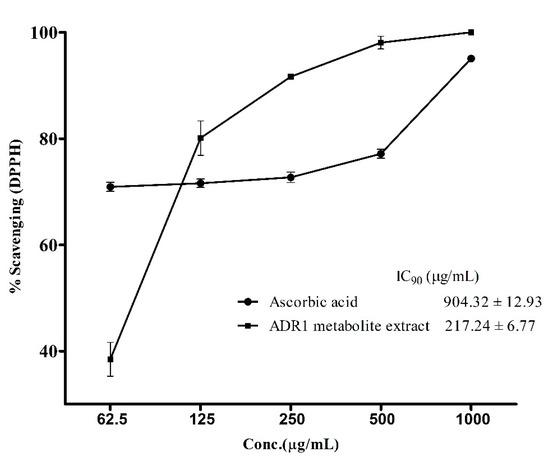 Antioxidants assume significance for therapeutic applications in view of their role in neutralizing reactive oxygen species in patients fighting diseases involving infectious agents or metabolic disorders [60,61,62]. Hence, it was prudent to examine if the ADR1 metabolites possessed any such activity. The standard assay, which measured the reduction of DPPH free radical, revealed the antioxidant properties of ADR1 metabolites (Figure 5). The free radical scavenging activity of the metabolite extract and of ascorbic acid (a well-known antioxidant agent), followed a different pattern, where a sharp increase in DPPH scavenging activity (from 40% to 80%) was observed when concentration of the metabolite was increased from 62.5 to 125 µg/mL. However, in the case of ascorbic acid, there was no significant change in the activity over the above concentration range. The IC90 value for DPPH scavenging by ADR1 metabolite was achieved at the concentration of 217.24 ± 6.77 µg/mL, while that for the ascorbic acid it was 904.32 ± 12.93 µg/mL (Figure 5), which was approximately 4-fold higher compared to ADR1 metabolites. However, interestingly IC50 of the ascorbic acid was 4.617 ± 0.89 µg/mL while that of ADR1 extract was 77.41 ± 1.02 µg/mL (not plotted). It was recently reported that the endophytic actinobacterial strains BPSAC77, 101, 121 and 147 showed DPPH scavenging, with an IC50 value of 43.2 µg/mL, but the IC90 value was not reported in this study [63]. In another study, Streptomyces sp. had been found to scavenge DPPH free radicals at a much higher concentration, with an IC50 value at 435.31 ± 1.79 μg/mL [64]. In one of the recent studies, it was reported that IC50 values for DPPH scavenging activities of several isolates of actinobacteria varied from 12 ± 1.8 to 65 ± 3.2 μg/mL [65]. Such variations were also noted by others [54]. These reports indicated that there was a wide variation in the antioxidant activities of the metabolites produced by different actinobacterial strains. An in-depth characterization of relevant compounds in pure form may offer further insight into such differences in the activities.