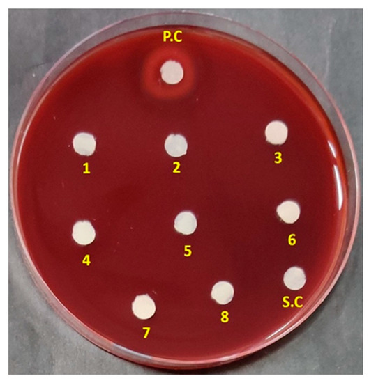 Hemolytic activity was determined by disc diffusion assay using sheep blood agar (SBA) plates (Himedia, Mumbai, India). A total of 10 µL solution containing varying concentrations of the ADR1 metabolites (1000 to 7.8125 μg/mL) were dispensed on discs placed aseptically on the SBA plates and were incubated for 24 h at 37 °C. The type of hemolysis was observed as alpha, beta and gamma [37].