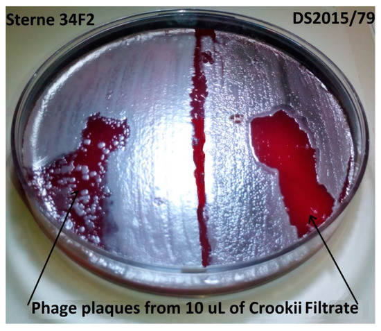 This study is the description of the unique isolation of a lytic bacteriophage, Bacillus phage Crookii infected B. anthracis DS201579 strain from a wildebeest carcass in Pafuri close to Crooks corner in KNP. In the diagnostic evaluation of the carcass site DS201579, the apparent “sterility” of the untreated blood agar plates drew special attention to the samples from this site. The novelty of the identification of Bacillus phage Crookii and its inherent appetite for B. cereus, B. thuringiensis and B. anthracis in culture is what sets this bacteriophage isolation apart. The heat-treated samples from the carcass site yielded B. anthracis spores, but only two small colonies on enrichment medium from a biological sample is unusual. When sub-cultured, plaques once again appeared over time, indicating that even these spores failed to escape infection. The inability to obtain isolates from the swab before the heat treatment indicates that the bacteriophage was active in the sample.