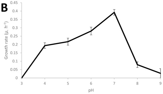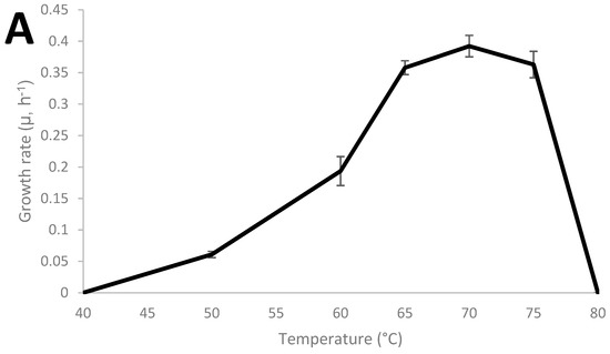 Thermoanaerobacter strain AK152 has 99.5% similarity to Thermoanaerobacter thermohydrosulfuricus based on sequencing of the 16S RNA gene (KR007666), as previously described [29]. The growth characteristics of the strain were characterized and the strain was found to grow from 45 °C to 75 °C with an optimum of 70 °C and a pH range from 4 to 8 with an optimum of pH 7 as shown in Figure 1A,B, respectively. Under the strain’s optimum growth conditions (70 °C, pH 7.0), a doubling time of 1.76 h (106 min) was observed.