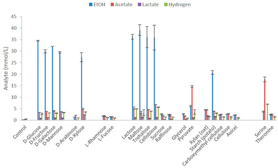 End product formation after 5 days by Thermoanaerobacter strain AK152 for selected carbon sources (65 °C, pH 7.0) at a concentration of 20 mM with the exception of polymeric substrates which were provided at 0.2% w/v. Values represent average of triplicate fermentations with standard deviation presented at error bars.