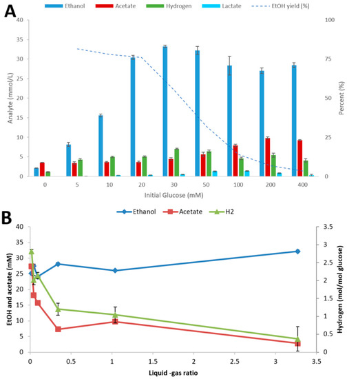 At initial glucose concentrations below 30 mM, the strain completely degraded the sugar with the main end-product being ethanol (Figure 3A). At higher substrate loadings strong inhibition occurred with almost no glucose degradation at the highest loadings used (400 mM). Different L-G ratios had some impact on the end product profiles of Thermoanaerobacter strain AK152 with ethanol concentrations highest at a high L-G ratio and acetate and hydrogen lowest and vice versa (Figure 3B). Thus, the ratio of ethanol from low to high L-G ratio increased by 37%, whereas acetate concentrations decreased by a factor of five with increasing L-G ratio.