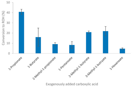 The ability of Thermoanaerobacter strain AK152 to reduce C1 to C8 carboxylic acids was evaluated in batch culture using glucose as a source of reducing potential. The fermentation profiles of strain AK152 on glucose-containing medium supplemented with carboxylic acids confirm that the strain could reduce C3 to C6 carboxylic acids to their corresponding alcohols, as shown in Figure 4. Conversion yields were between 4.7 and 40.7%, with higher conversions generally being observed for smaller carboxylic acids. A notable exception of this trend occurred in the case of the reduction of 2- and 3-methyl-1-butyrate for which conversion of around 20% were obtained. The highest observed conversion, 40.7%, was that of propionate to 1-propanol (8.08 mM). Only 4.7% of the hexanoate was converted to 1-hexanol to afford a concentration of less than 1.0 mM. While formate and acetate were examined, there was negligible evidence of methanol formation (from formate) and ethanol formation from acetate reduction was masked by background ethanol production from glucose fermentation.