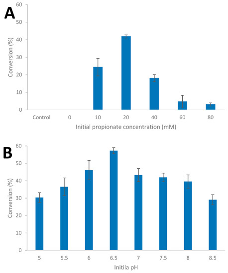 In order to evaluate the impact of culture conditions on carboxylic acid reduction, the influence of increasing initial concentration of the carboxylic acid, and initial pH, were evaluated in batch culture; it should be noted that the BM medium used contains 50 mM of phosphate buffer. The strain was cultivated on glucose (20 mM) supplemented with between 10 and 80 mM of carboxylic acid as shown for propionate (Figure 5A) and the influence of initial pH between 4.0 and 8.5 (Figure 5B, Table S4).
