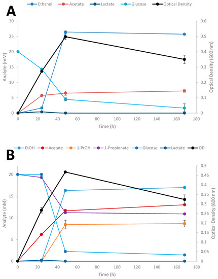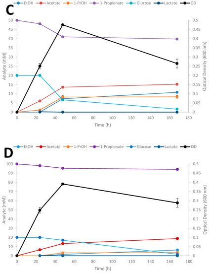 In the context of 1-PrOH production produced by other means, such as fermenation from wild-type and genetically modified organisms, the ability of strain AK152 is modest but presents a novel route to 1-propanol and other primary alcohols from their corresponding carboxylic acids. Most of the literature on the fermentation production of 1-propanol among Clostridia is limited, typically with only trace quantities being reported (Table 1). As such, the yields reported here from the bioreduction of propinate fall short of the 3.5 g/L achieved using genetically modified E. coli [25] but are higher than those previously reported for propioante reduction by T. pseudoethanolicus. While the conversion efficiences of Thermoanaerobacter strains are lower than some of the CO- utilizing Clostridium strains that have been reported [35,36], it is noteworthy that Thermoanaerobacter strain AK152 achieves its maximum conversion within 48 h (Figure 6B) rather than over several days in cases where CO is used as a source of reducing potential, which may be due to the limitations of gas solubility and mass transfer. Achieving rapid carboxylic acid reduction with higher conversion efficiencies using strain AK152 or other Thermoanaerobacter strains might be possible using fed-batch fermentations or by using a biphasic system or gas stripping for continuous alcohol removal.