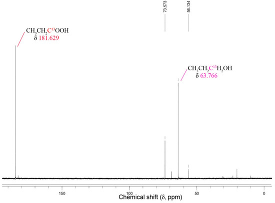 A peak attributable to the 13C-labeled propionate and its corresponding alcohol are apparent at 181.6 ppm, and 73.7 ppm, respectively. The relative intensity suggests that about 40% of the 13C-labeled propionate was reduced to 1-propanol. Similar results for 13C1-labeled acetate and 1-butyrate were obtained (Supplementary Figure S3).