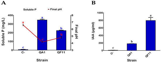 Production of IAA by bacteria is considered one of the remarkable PGPR features. QA1 and QF11 strains were assessed, in vitro, for their capacity to produce IAA in TSB medium supplemented with 0.1% L-tryptophan as a metabolic precursor for IAA synthesis (see Materials and Methods). Seven days post incubation, both tested strains were able to produce IAA with significantly various concentrations as illustrated in Figure 1B. The highest amount was obtained in QF11, 795.31 ± 80.06 µg/mL, while QA1 produced 180.5 ± 2.22 µg/mL.