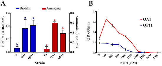 Salinity is an abiotic stress that affects bacterial development. To assess the ability of QA1 and QF11 to tolerate salt stress conditions, bacteria were first grown with increasing NaCl concentrations in TSA. We found that the growth of QF11 was inhibited at 900 mM NaCl while QA1 tolerated 2000 mM NaCl final concentration (Table 2). Subsequently, salt stress tolerance was tested in liquid medium. Bacteria grown in TSB containing increasing NaCl concentrations were quantified by measuring the OD600nm following 48 h of incubation. We found that QF11 showed low salt stress tolerance, with a maximum growth observed at 0 mM NaCl and decreasing bacterial mass with increasing salt concentrations, until a total growth inhibition at 1800 mM NaCl. Comparatively, the maximal growth of QA1 strain was seen at 300 mM NaCl, while its total growth arrest was detected at 2400 mM NaCl (Figure 2B).