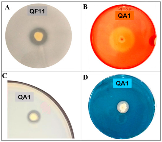 Bacterial extracellular enzymes such as proteases and cellulases are involved in soil fertilization and the biocontrol of phytopathogens through microbial membrane degradation [50]. Therefore, we monitored protease and cellulase production by the two strains (Figure 3B,C). In the cellulase production assay, the ratio “halo diameter/colony diameter” was 4.21 for QA1. Protease was also produced by QA1 (Figure 3C) with a diameter rate of 1.07 (Table 2). Neither protease nor cellulase activities were detected using QF11 strain.