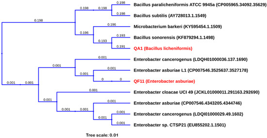 3.7. QA1 and QF11 Belong to the Genus of Bacillus Licheniformis and Enterobacter Asburiae, Respectively