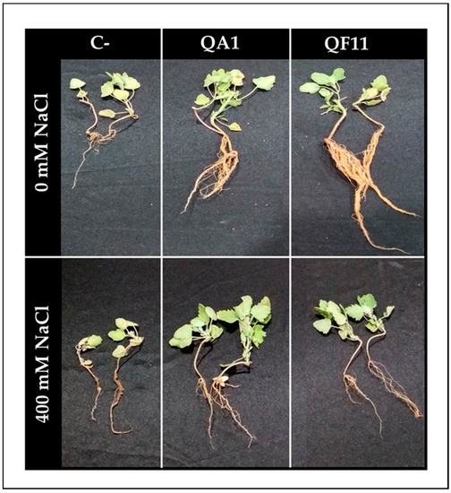 Interactions of bacteria within the tripartite “plant–soil–microbes” microcosm are determinants for their functional diversity. Therefore, an in vivo test is of considerable importance as it simulates field conditions. As expected, inoculated quinoa plants showed a higher growth capacity compared to uninoculated plants which produced a lower quantity of biomass (Figure 6). Interestingly, QF11 significantly promoted root development and weight under non-saline irrigation (Figure 6 and Figure 7A,C,F) by 381.48% for root fresh weight and 61.22% for root length. Moreover, saline irrigation negatively affected plant growth compared to sets irrigated by non-saline water (Figure 7C,F).