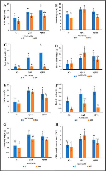 Effect of selected PSB on quinoa plant growth after 45 days of cultivation under non-saline (0 mM NaCl) and saline (400 mM NaCl) irrigations. (A) Root length, (B) shoot length, (C) root fresh weight, (D) shoot fresh weight, (E) leaf area, (F) root dry weight, (G) shoot dry weight, (H) leaf chlorophyll content index. The values represent means of replicates (n = 4) ± standard deviations. The different letters in superscript (a, b, c…) indicate the statistically significant difference at 95% between treatments.