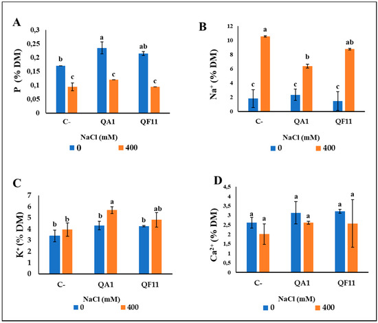 Effect of salt stress induced by NaCl and bacterial inoculation on the uptake of phosphorus (P) and salt ions by quinoa plants. (A) P (B) Na+ (C) K+ (D) Ca2+. The values represent means of replicates (n = 4) ± standard deviations. The different letters in superscript (a, b, c…) indicate the statistically significant difference at 95% between treatments.