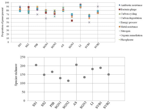 We found significant differences in the distribution of taxonomic species and individual functional genes across sites (pairwise t-test with Holm adjustment, p < 0.05; Figure 1). In addition, species richness also varied across sites. From all of the genes included in the microarray, the proportion present in each site per function also differed across sites. The number of species detected here was low compared to taxonomy-based studies (as expected given the diversity study was based on a fixed set of markers used for comparative purposes only). This suggests that most of the species in the system are yet to be identified, and consequently, the functional genes here detected come from unidentified or uncultured bacteria species (which is consistent with previous studies).