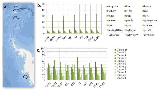 Geographical distribution. (a) Geographical location of the study sites in the Antarctic. Antarctic: SGN: South Georgia North; SS: South Sandwich; LI: Livingston Island; AS: Amundsen Sea; PIB: Pine Island Bay. Arctic: SVB: Svalbard. (Note SVB1 and SVB2 are two samples from an Arctic location in Svalbard, not shown in the map). (b) distribution of the WGCNA modules. The colour names in the legend of panel a refer to each of the WGCNA modules as defined by the method. (c) distribution of the K++ means clusters across Arctic and Antarctic locations. The columns are coloured in a gradient of genetic density per module or cluster (i.e., darker columns represent modules/clusters with more genes, whilst those including less genes are shown in lighter colours). WGCNA module and K++ means cluster distribution did not differ significantly across geographic locations. The data are presented as standardized for the number of genes per functional type included in the microarray. The functions included are listed in Supplementary Table S1.