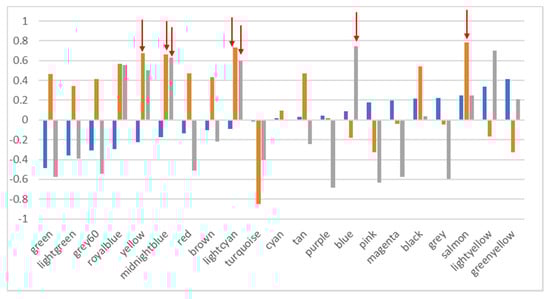 Correlation (y-axis) in the geographical distribution between WGCNA phylogenetic modules and functional WGCNA modules. The three columns represent the correlation coefficient for each of the three phylogenetic modules (Blue: PHYLO1; Orange: PHYLO2; Grey: PHYLO3) with the functional modules on the y-axis. Red arrows highlight the correlations that are significant.
