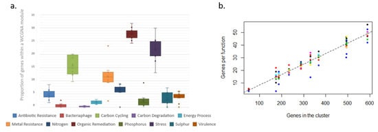 Functional gene distribution within clusters. (a) proportion of genes within a WGCNA module. (b): linear trend between the number of genes associated to any of the functions and the total number of genes in each KMeans++ cluster; the individual R2 values for the linear relations between genes per function and genes in the cluster per cluster vary between 0.71 for virulence genes to 0.99 for stress and carbon cycling genes. The data are presented as standardized for the number of genes per functional type in the microarray.