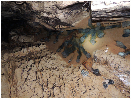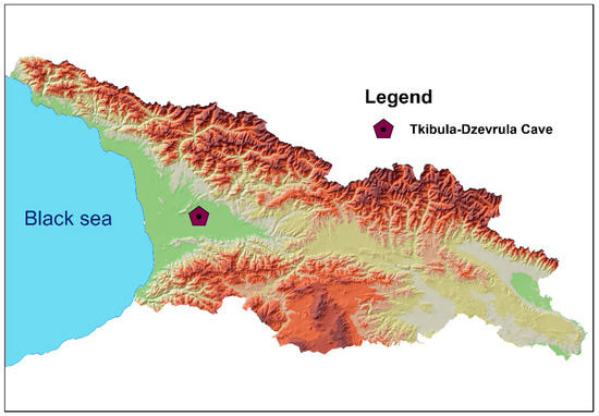 Dead bats were found in a karst cave (Tkibula-Dzevrula) located on the border between Tkibuli and Terjola municipalities of Imereti Region in western Georgia (42.276° N/42.951° E), on the Okriba-Argveta ridge, in the basin of the river Tkibula-Dzevrula (Figure 1 and Figure 2). The cave has three entrances with an interchange of short vertical shafts and inclined steps that are connected to the sub-horizontal gallery. The gallery has many branches that are variable in length and water content. Total length of the cave is 1635 m (5364 ft), with a width of 3–20 m (9.8–65 ft) and a height of 4–15 m (13–49 ft). Stalactites and stalagmites are present. The air is dynamic and the temperature in dry areas varies between 10.4–11.4 °C (50.7–52.52 °F) [9].
