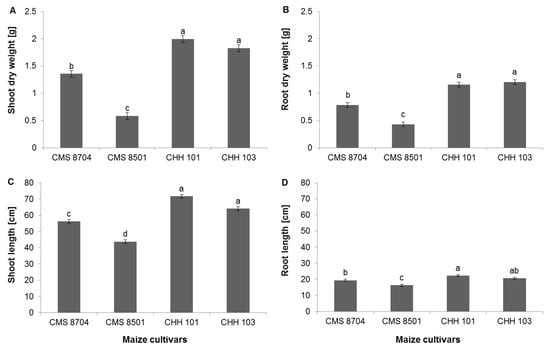 The accumulation of biomass by eight-week-old plants, averaged over all four treatments (no stress, salinity stress, phosphorous (P) deficiency, and salinity stress + P deficiency). (A) Shoot dry weight, (B) root dry weight, (C) shoot length, (D) root length. CMS 8704, CMS 8501: Composite varieties, CHH 101, CHH 103: F1 hybrid varieties. Values are shown in the form mean ± SD (n = 6). Within each variety, values marked by the same letter do not differ significantly (p < 0.05) from one another.