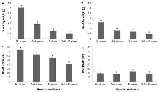 Exposure to salt stress compromised both shoot elongation and the accumulation of biomass by both the shoot and root more severely than exposure to P deficiency, while exposure to combined salt and P stress was even more damaging (Figure 2). Root elongation was not inhibited by neither salinity stress or combined P and salt stress treatments and was even promoted by P deficiency.