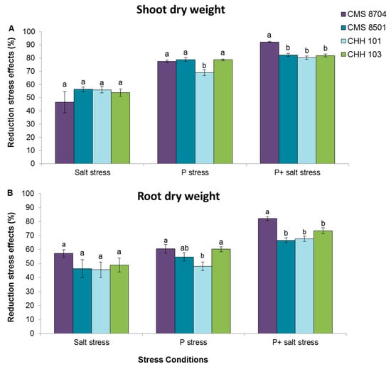 There was no varietal effect with respect to the response to salinity stress, as all four of the varieties exhibited a similar reduction (~50%) in both shoot and root dry weight (Figure 3). P deficiency had a comparable effect on CMS 8704, CMS 8501, and CHH 103 plants: Their shoot dry weight fell to 77.6–78.9% of the performance of non-stressed plants, while their root dry weight fell to 54.7–60.5%. Likewise, maize cultivars CMS 8501, CHH 101, and CHH 103 exhibited a similar response to combined salt and P stress: Their shoot dry weight fell to ~80% of the control, and their root dry weight to ~70%. The effect of combined salt and P stress on CMS 8704 plants was more drastic: Their accumulation of shoot and root dry matter was reduced by, respectively, 92% and 82% (Figure 3). The variety that best adapted to P deficiency was CHH 101: These plants suffered a 69% reduction in shoot dry weight and a 48% reduction in root dry weight (Figure 3).