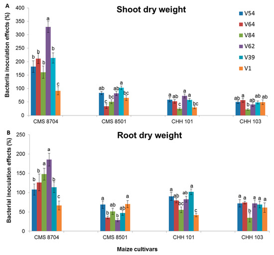 There was a significant level of variation both between the varieties as to the extent of the benefit of inoculation with a given strain, and between the extent of the boost to growth provided by each bacterial strain for a given variety. The advantage of inoculation was generally higher for the composite varieties (particularly CMS 8704) than for the F1 hybrid varieties (Figure 5). The performance of each variety averaged over all six bacterial strains was consistent with this conclusion (Figure S4). CMS 8704 responded most strongly to inoculation with a PGPR in terms of biomass accumulation (Figure 5). The Arthrobacter sp. strains V54 and V64, and the Bacillus sp. strains V39 and V62 were generally more effective as growth promoters than either Arthrobacter sp. strain V84 or Bacillus sp. strain V1 (Figure S5).