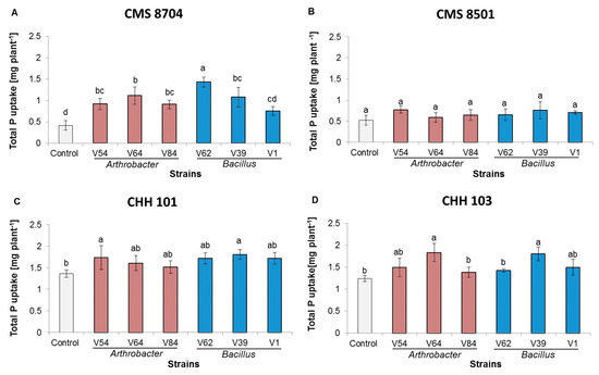 Inoculation also influenced the shoot and root P content (Figure 6). A significant positive effect on CMS 8704 plants was apparent for the five PGPR strains V39, V54, V62, V64, and V84, on CHH 101 plants for two strains (V39 and V54) and on CHH 103 plants for two strains (V39 and V64). The P uptake by CMS 8501 plants was not promoted by PGPR inoculation.