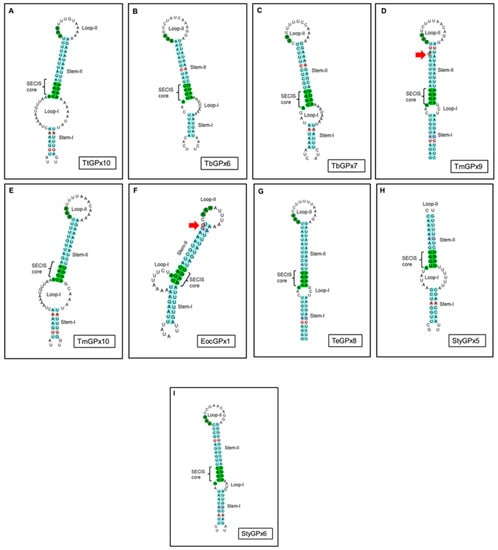 Usually, SECIS elements are mandatory for Sec incorporation but their presence does not necessarily lead to the incorporation of Sec. In fact, in Drosophila [], a double mode of SECIS elements has been described, one leading to the incorporation of Sec and the other without the incorporation of Sec, and it is not yet known which amino acid is incorporated. All ciliate GPx with SECIS elements are not Sec-GPx, and only two of them (TtGPx10 and EocGPx1 with a 3’ UTR SECIS) have Cys in the same place that would correspond to Sec, the rest incorporate other different amino acids.