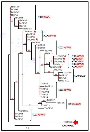 Glutathione peroxidase (GPx) is a family of isoenzymes that catalyze the reduction of H2O2 or organic hydroperoxides to water or corresponding alcohol using GSH. These enzymes may or may not contain Sec (selenium-independent GPx or NS-GPx). Many NS-GPx use Trx instead of GSH as a reducing power source, and for this reason they have been considered atypical peroxyredoxins (PRx), although their amino acid sequence shows greater similarity to GPx. Among the 91 ciliate GPx isoforms analyzed, only 11 (12%) have Sec in their catalytic motif, one of them in T. thermophila (TtGPx12). Ciliate GPx can be considered as GPx independent of selenium, or NS-GPx, like other mammal or plant GPx, which incorporate Cys instead of Sec in the conserved catalytic motif [,].