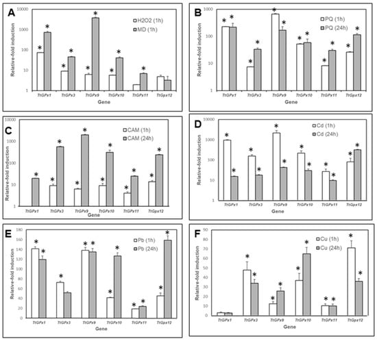 Lead (Pb2+) also induces the expression of all selected TtGPx genes. In some of them (TtGPx1, TtGPx9 and TtGPx11), there is not much difference between the 1- and 24-h treatments. However, in TtGPx10 and TtGPx12, there is a considerable difference between both treatments, as the 24 h treatment shows much higher induction values (Figure 3E). The highest values are shown by TtGPx1, TtGPx9 (1- or 24-h treatment) and TtGPx10 and TtGPx12 (24-h treatment) (Table S5). Finally, copper (Cu2+) also induces the expression of most of the selected genes, except for TtGPx1, which does not present a significant induction (Figure 3F). The highest induction values are those shown by the TtGPx12 gene (1-h treatment) and TtGPx10 (24-h treatment) (Table S5).