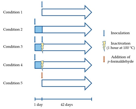 The bioleaching assay was performed in Erlenmeyer flasks containing 150 mL of MAC at pH 2 supplemented with 10 g/L mineral. Inoculation was performed using enough volume of a pellet resuspended in fresh medium to reach 1 × 108 cells/mL in the flasks. The pellet was prepared by centrifugation of a filtered growth culture (<2 µm pore to eliminate insoluble sulfur) in the same conditions as described in Section 2.1. Flasks were incubated at 65 °C with agitation at 150 rpm for 42 days. Different conditions were tested in triplicate, including (Figure 1): (1) inoculation at the beginning of the assay (t0); (2) inoculation a day before t0 and replacement of the liquid medium at t0, maintaining the pre-colonized mineral; (3) inoculation a day before t0, inactivation of microorganisms at t0 by exposure for 1 h at 100 °C, followed by a replacement of the liquid medium and re-inoculation; (4) the same conditions as in (3) but without re-inoculation, and (5) replacement of inoculum by an addition of the same volume of p-formaldehyde (PFA) at the beginning of the assay (sterile control).